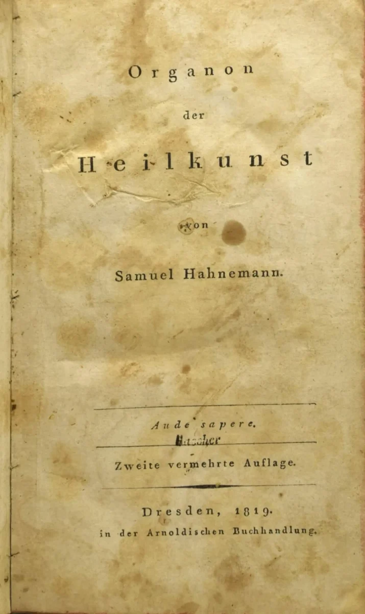 Cover of the first edition of Organon der rationellen Heilkunde (Dresden, 1819), by Dr. Samuel Hahnemann.
